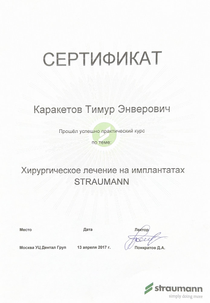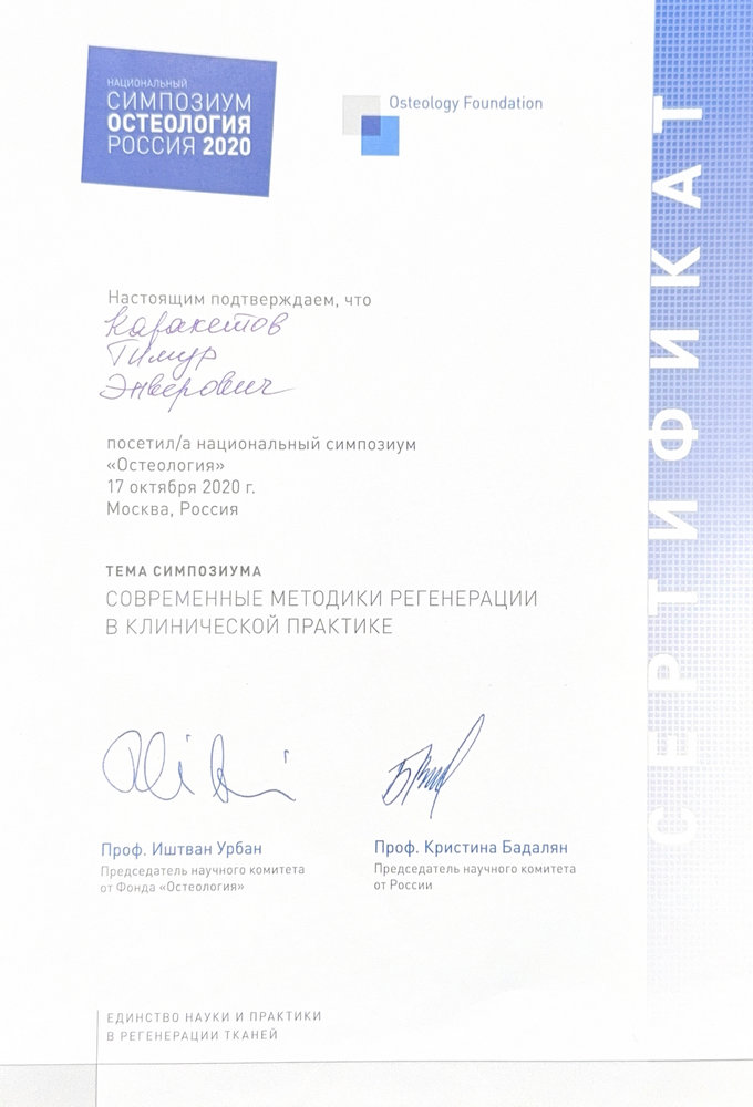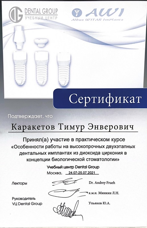 2014г. — Сертификат специалиста, НОУ ДПО Ставропольский институт повышения квалификации «ЮТАМЕДФАРМ», г. Ставрополь, допущен к осуществлению медицинской или фармацевтической деятельности по специальности «Стоматология хирургическая». Сертификат действителен в течение 5 лет;
